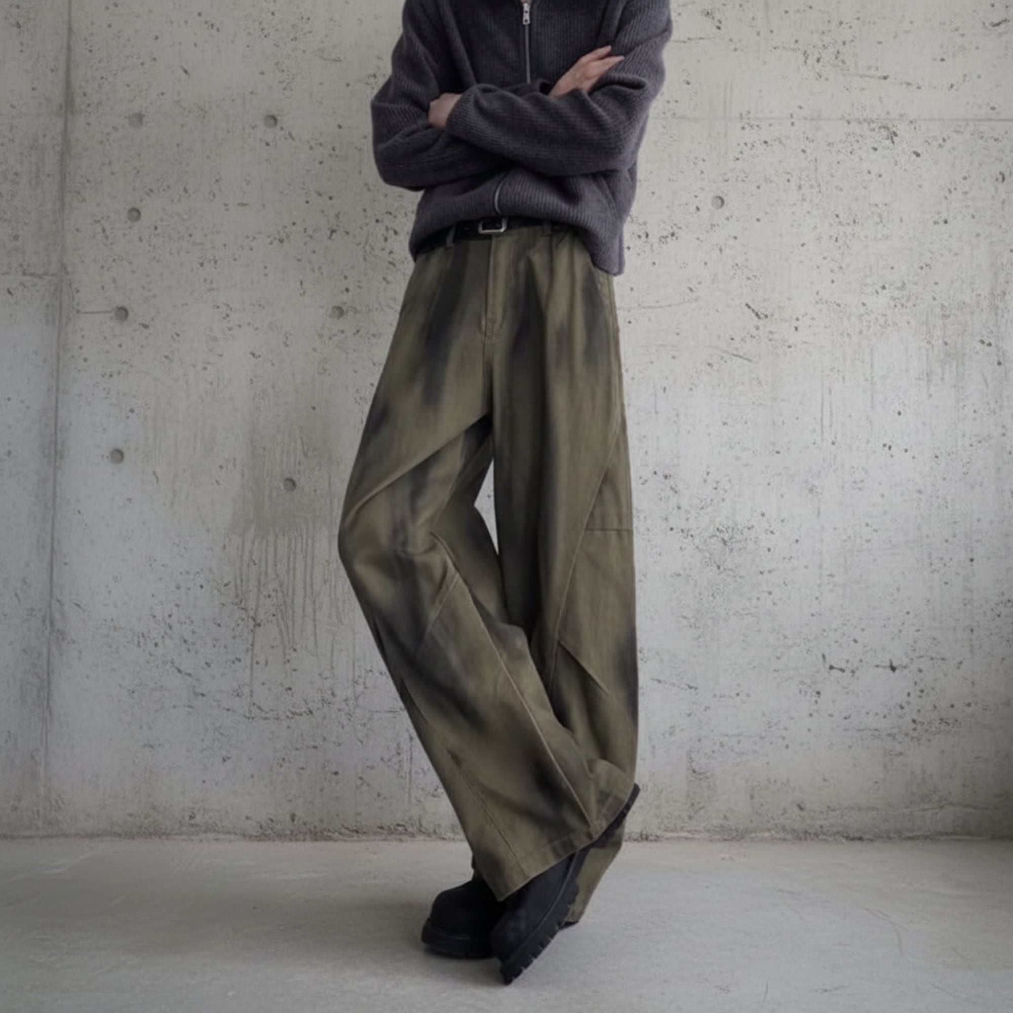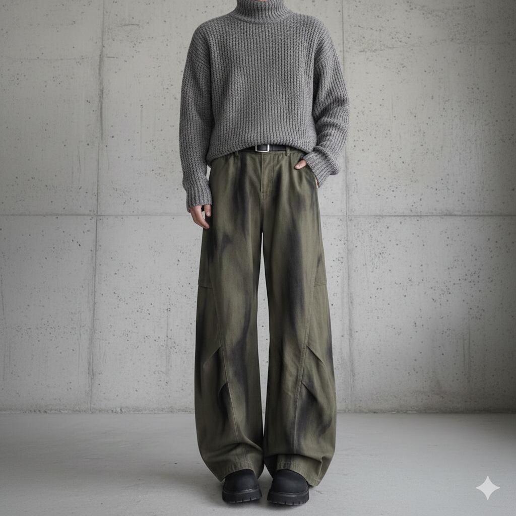独特の「フェードタイダイ加工」と、計算された「立体的な切り替え」が目を引く、アーミーグリーンのワークデニム。