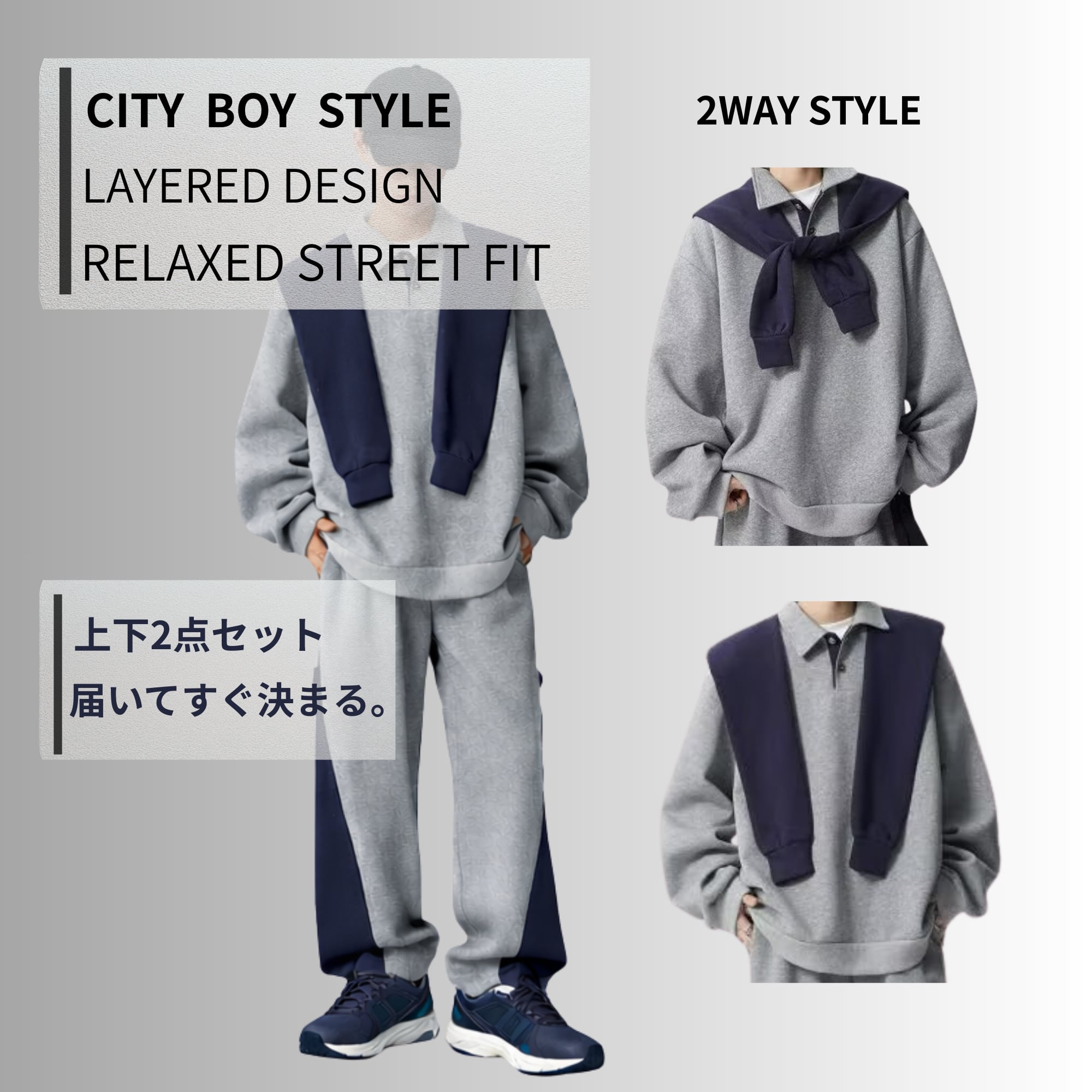 襟付き レイヤード スウェットセットアップ|オーバーサイズ ストリート 上下2点