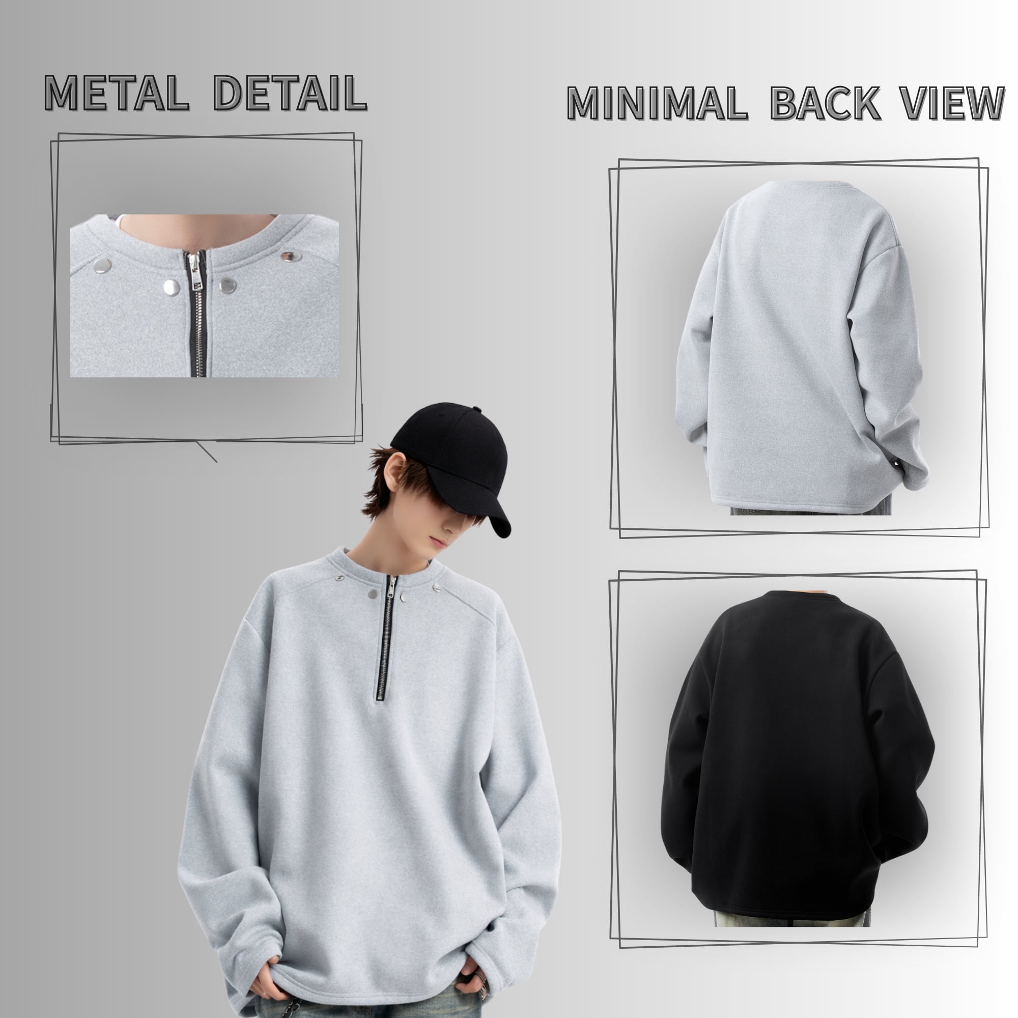 スタッズ ハーフジップ スウェット|オーバーサイズ ミニマルストリート